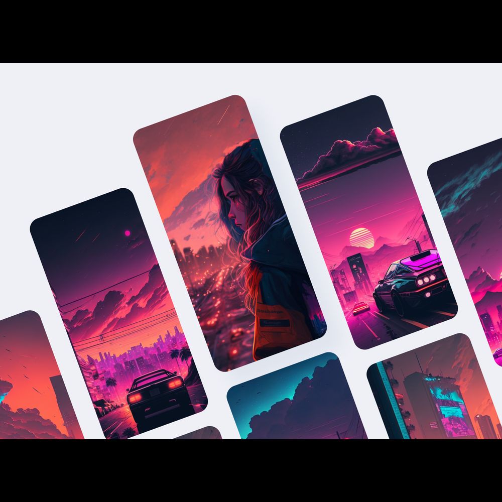 Get ready to take your phone's wallpaper to the next level with our Synthwave Wallpaper Pack! This pack includes 8 high-quality wallpapers with a Synthwave theme, perfect for adding some retro-futuristic vibes to your phone. Inside the pack, you'll find 4 wallpapers featuring cars and 4 featuring people, all in the vibrant, neon-drenched style of Synthwave. These wallpapers are designed to be used on mobile phones, so you can easily download and set them as your background. So if you're a fan of Synthwave and want to add some of that retro-futuristic flair to your phone, this pack is for you! Get it now and give your phone the upgrade it deserves.
